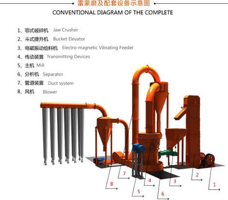整機(jī)結(jié)構(gòu)是由主機(jī)、分析機(jī)、管道裝置、鼓風(fēng)機(jī)、鄂式破碎機(jī)、畚斗提升機(jī)、料倉、電磁振動給料機(jī)、配電柜等組成。機(jī)器工作過程:大塊狀物料經(jīng)鄂式破碎機(jī)破碎到所需粒度后,由提升機(jī)將物料送到料倉,再經(jīng)振動給料機(jī)將料均勻定量連續(xù)地送入主機(jī)磨室進(jìn)行研磨,粉磨后的粉子被風(fēng)機(jī)氣流帶走,經(jīng)分析機(jī)進(jìn)行分級,符合細(xì)度的粉子隨氣流進(jìn)入大旋風(fēng)收集器內(nèi),進(jìn)行分離收集,再經(jīng)出粉管排出即為成品粉末。